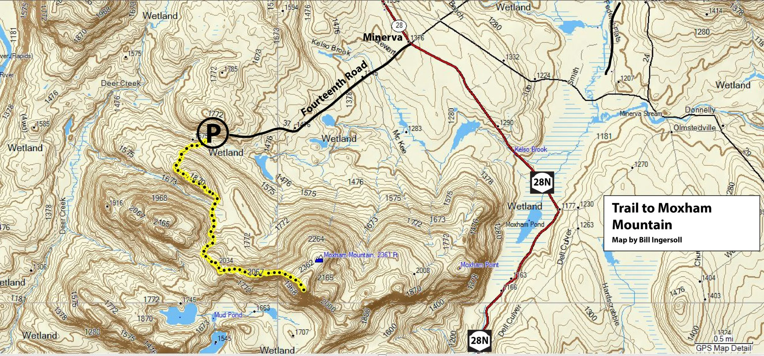 Follow NY 28N to the hamlet of Minerva, located in southern Essex County. From the four corners in the middle of town, turn southwest onto Fourteenth Road, so named because it leads into Township 14 of the old Totten and Crossfield Purchase. This dead-end road starts off as a paved county byway but eventually turns to gravel, dropping into the valley at the northern foot of the mountain. The trailhead for Moxham is 2.1 miles from Minerva, and it is plowed in the winter. Moxham Mountain is in the Vanderwhacker Mountain Wild Forest.