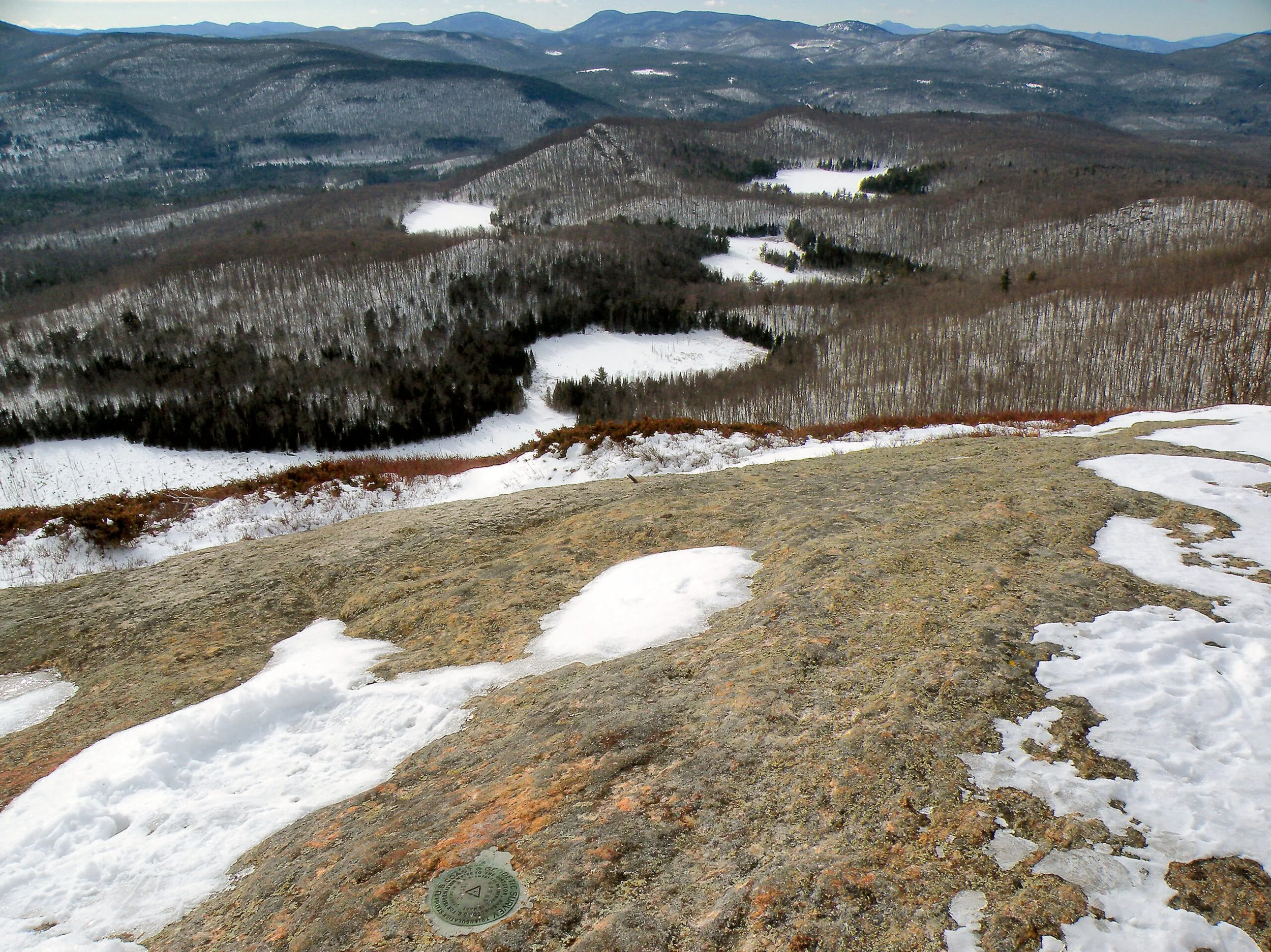 The thrust of the view is southwest, meaning that the best time to experience the mountain is in the morning, especially if you want to come away with good pictures. The chain of beaver meadows and ponds at the foot of the mountain point the way like landing lights on a runway toward the mountains west of the Hudson River. Of these, the remote peaks of the Siamese Ponds Wilderness are the most prominent, especially Bullhead and Puffer. The knobby summit of Snowy Mountain can be easily picked out from the lineup of peaks on the western horizon.